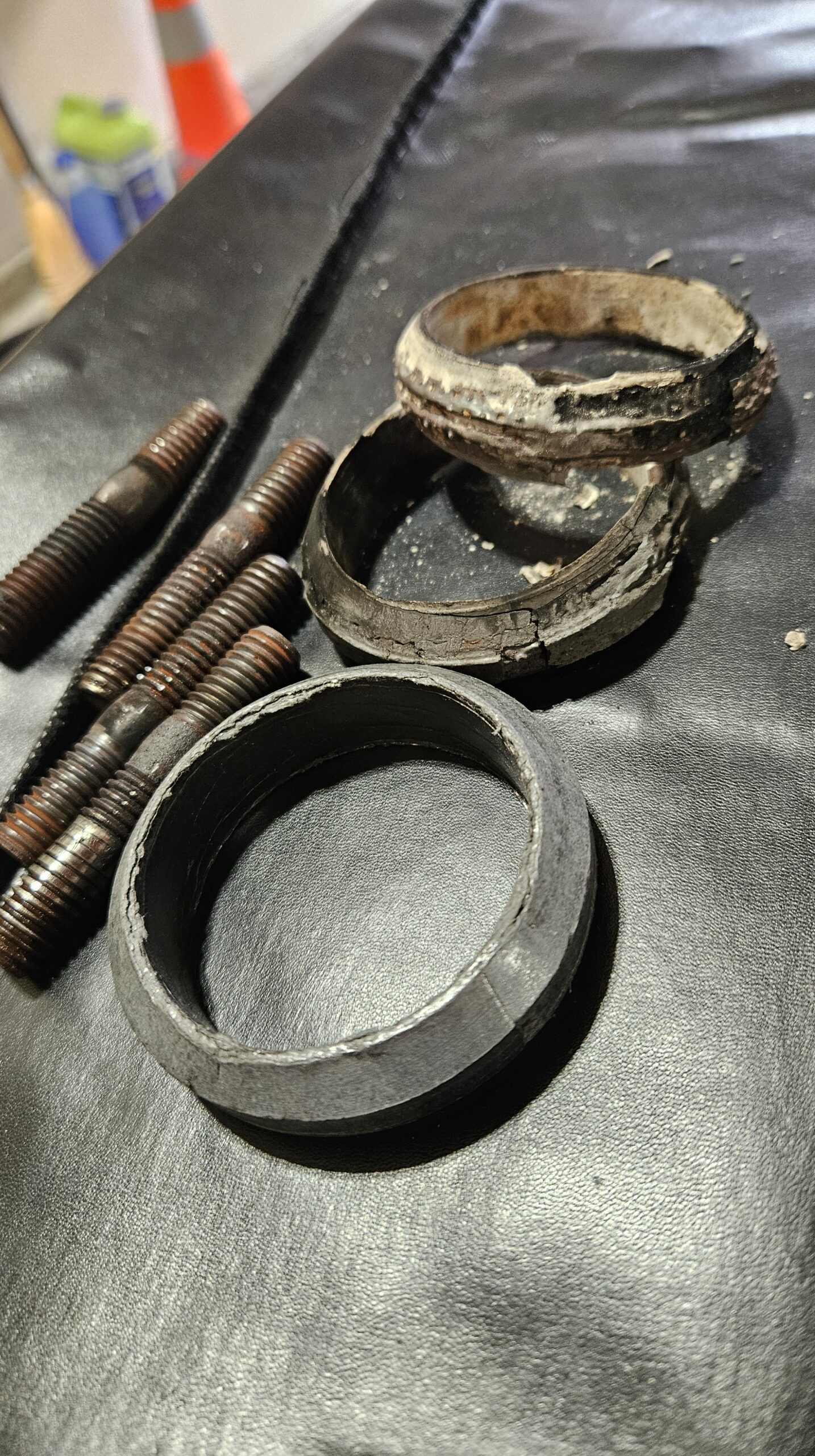 After I cut the bracket – which… doing that right next to the gas tank was a special experience – I was able to lower the pipes enough that I **finally** got access to the donut gasket between the manifold and downpipe (as mentioned way earlier in this blog) – or what is left of them.