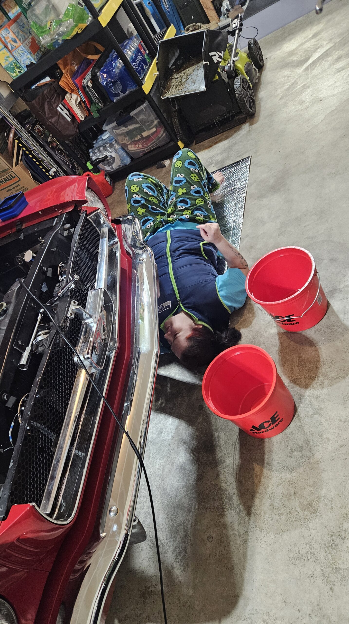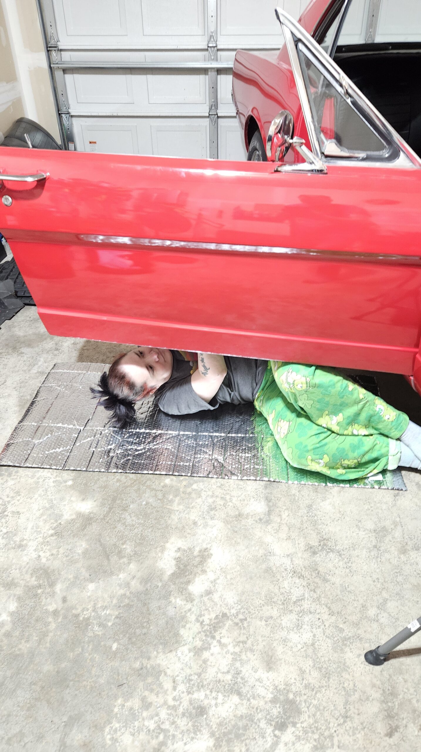 We moved the other car out of the garage, and parked Emma diagonally. She’s easier to work on that way.