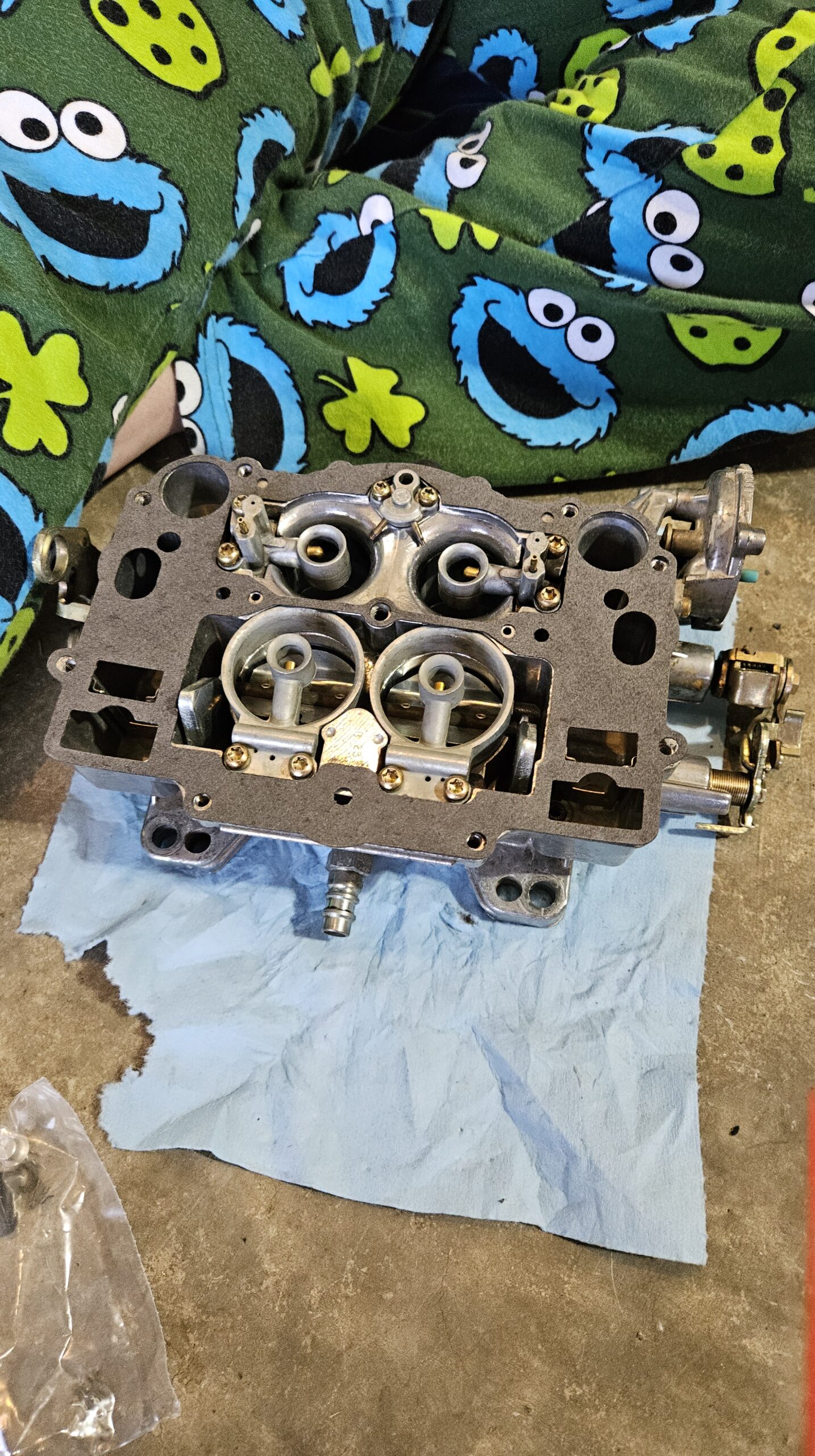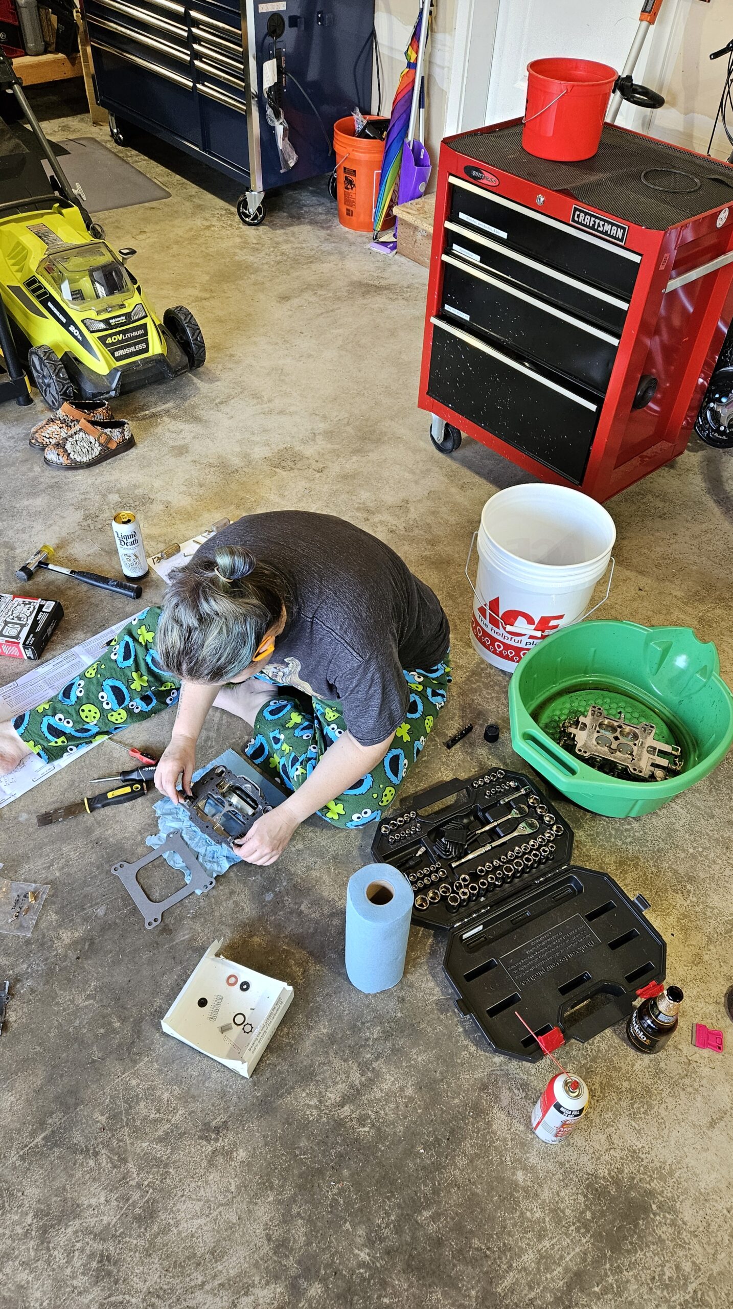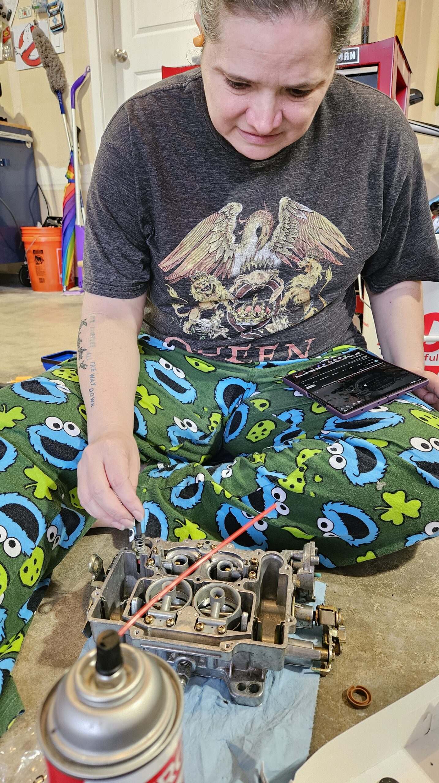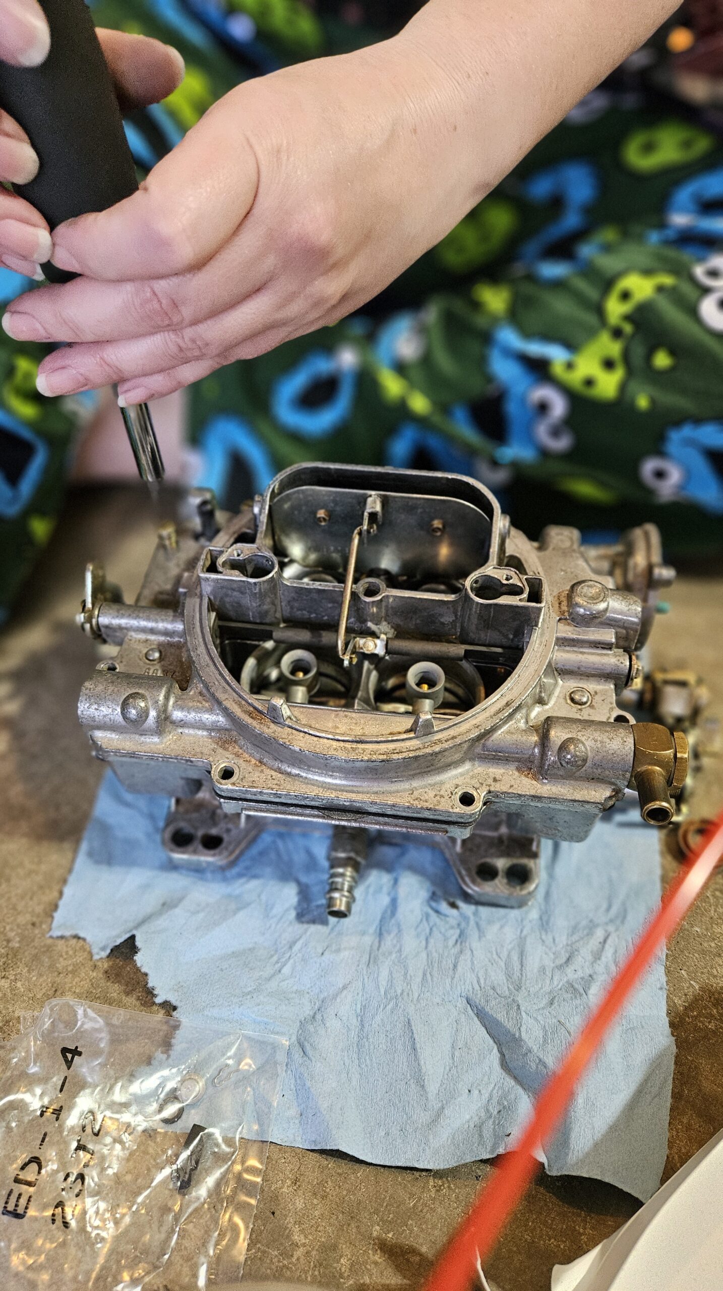 So, while we wait for her to dry up from the flooding, April decided to help me rebuild the carb with a brand new Edelbrock 1477 kit.