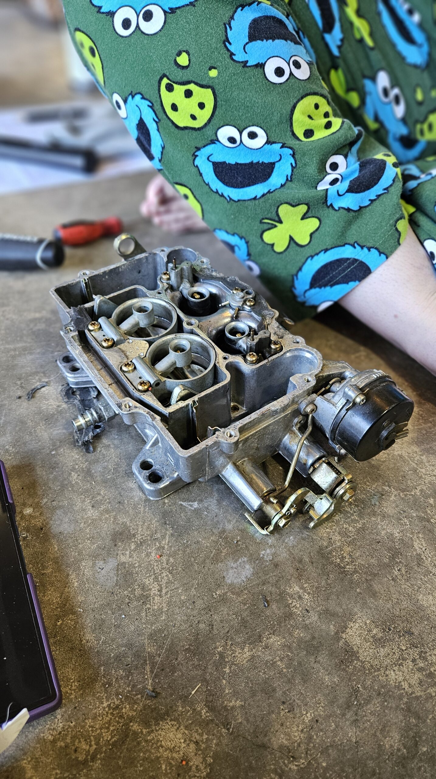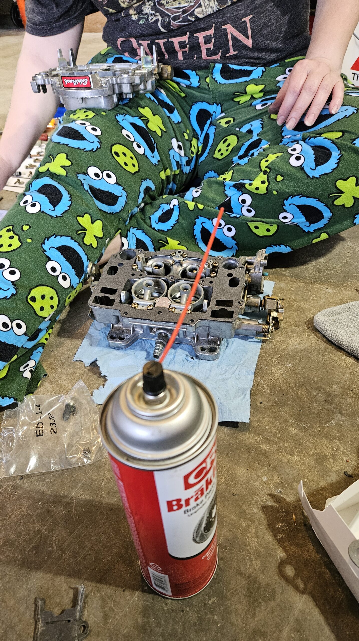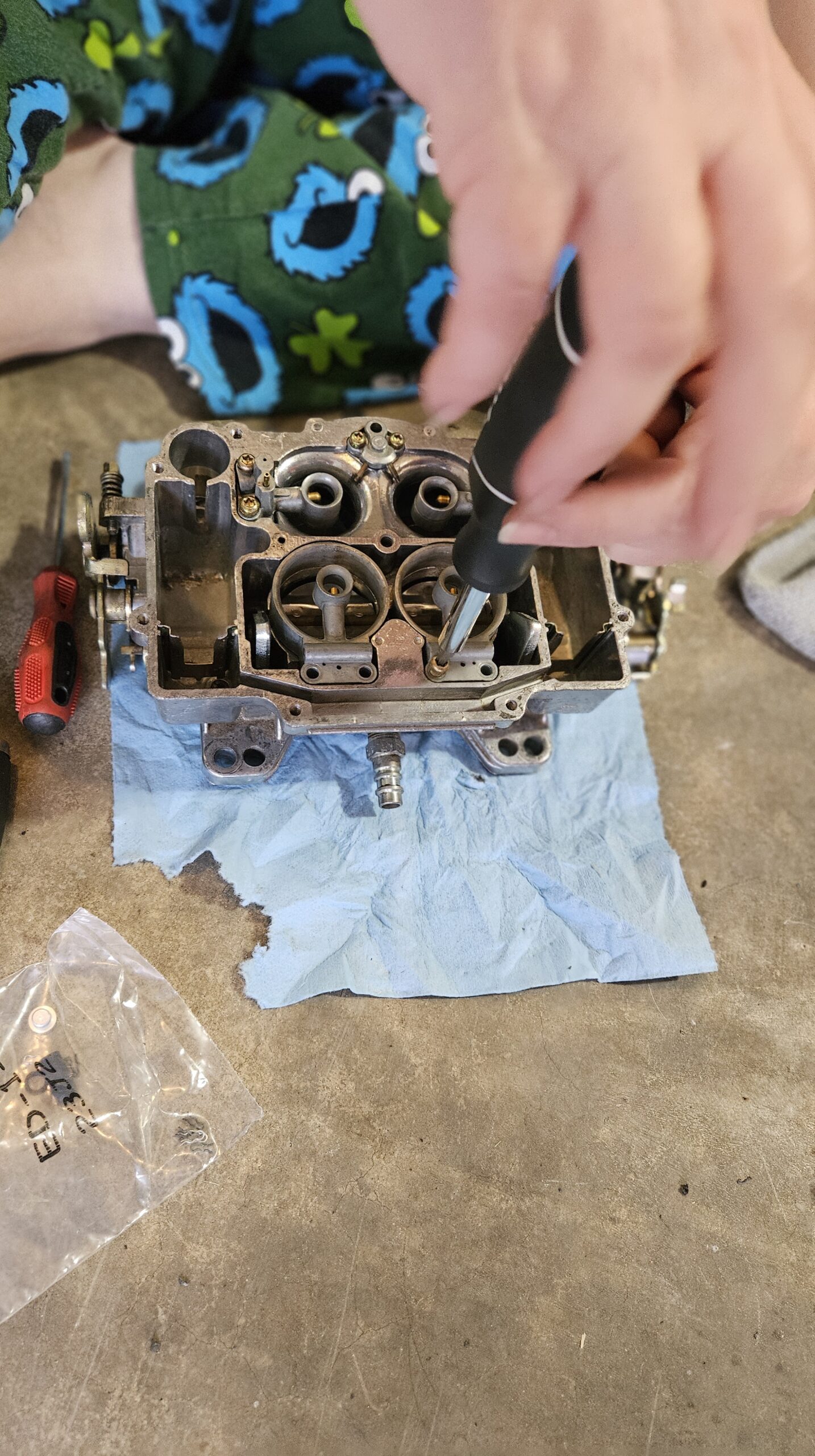 So, while we wait for her to dry up from the flooding, April decided to help me rebuild the carb with a brand new Edelbrock 1477 kit.